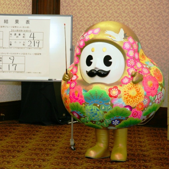 厳かな雰囲気の中行われた抽選会では、抽選結果の確認作業など、ひゃくまんさんもお手伝い。終了後は、ひゃくまんさんの得意ポーズ「七転び八起き」を造幣局のキャラクター「コインくん」と一緒に披露しました。