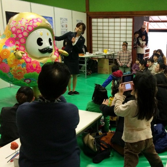 観光PRブースで行われた和菓子作り体験は、無料で職人から和菓子作りを教われるとあって大人気。ひゃくまんさんも参加者の手元を覗き込み、興味深々の様子。